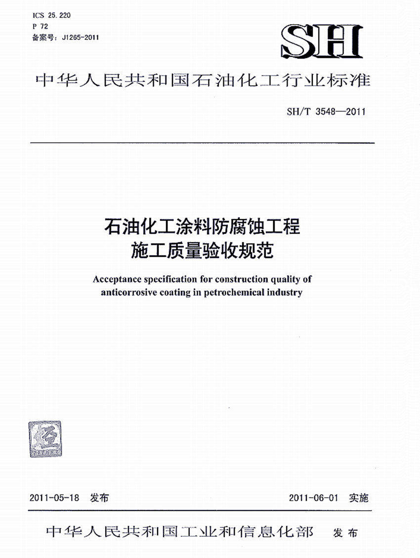 石油化工涂料防腐蝕工程施工施工質(zhì)量驗(yàn)收規(guī)范標(biāo)準(zhǔn)SH/T 3548-2011 ICS25.220 P72 備案號(hào):J1265-2011 SH 中華人民共和國(guó)石油化工行業(yè)標(biāo)準(zhǔn) SH/T 3548-2011石油化工涂料防腐蝕工程施工施工質(zhì)量驗(yàn)收規(guī)范 Acceptance spccificatinon for construction quality of anticorrosive coating in