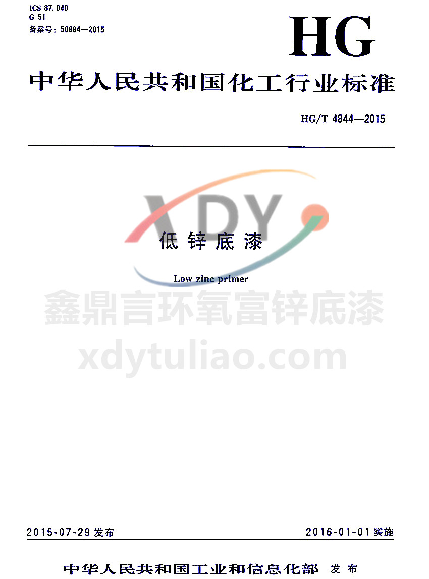ICS 87.040 G51 備案號:50884-2005 HG 中華人民共和國化工行業(yè)標準 HG/T 4844-2015 低鋅底漆Low zinc primer 2015-07-29發(fā)布 2016-01-01實施 中華人民共和國工業(yè)和信息化部 發(fā)布 本標準規(guī)定了低鋅底漆的產(chǎn)品分類、要求、試驗方法、檢驗規(guī)則、標志、包裝和貯存。本標準適用于不揮發(fā)分中金屬鋅含量低于60%但不低于40%的低鋅涂