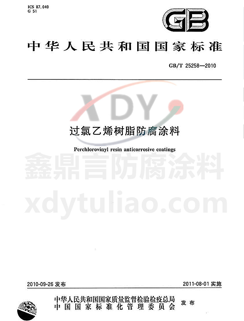 過氯乙烯樹脂防腐涂料國家標準GB/T25258-2010 ICS87.040 G51 GB 中華人民共和國國家標準 GB/T 25258-2010過氯乙烯樹脂防腐涂料Perchlorovinyl resin anticorrosive coatings 2010-09-26發(fā)布 2011-08-01實施 中華人民共和國國家質(zhì)量監(jiān)督檢驗檢疫總局 中國國家標準化管理委員會 發(fā)布 本標準規(guī)定了過氯乙烯樹