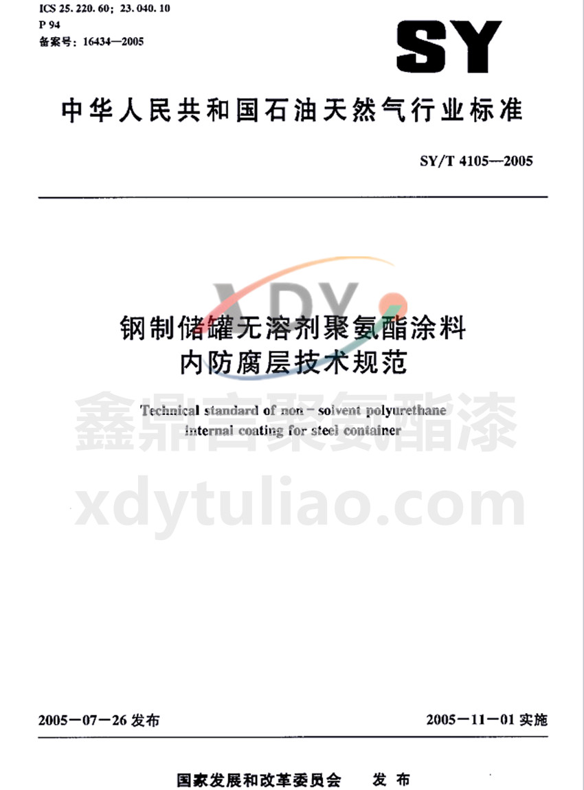 鋼制儲罐無溶劑聚氨酯涂料內防腐層技術規(guī)范標準SY/T 4105-2005