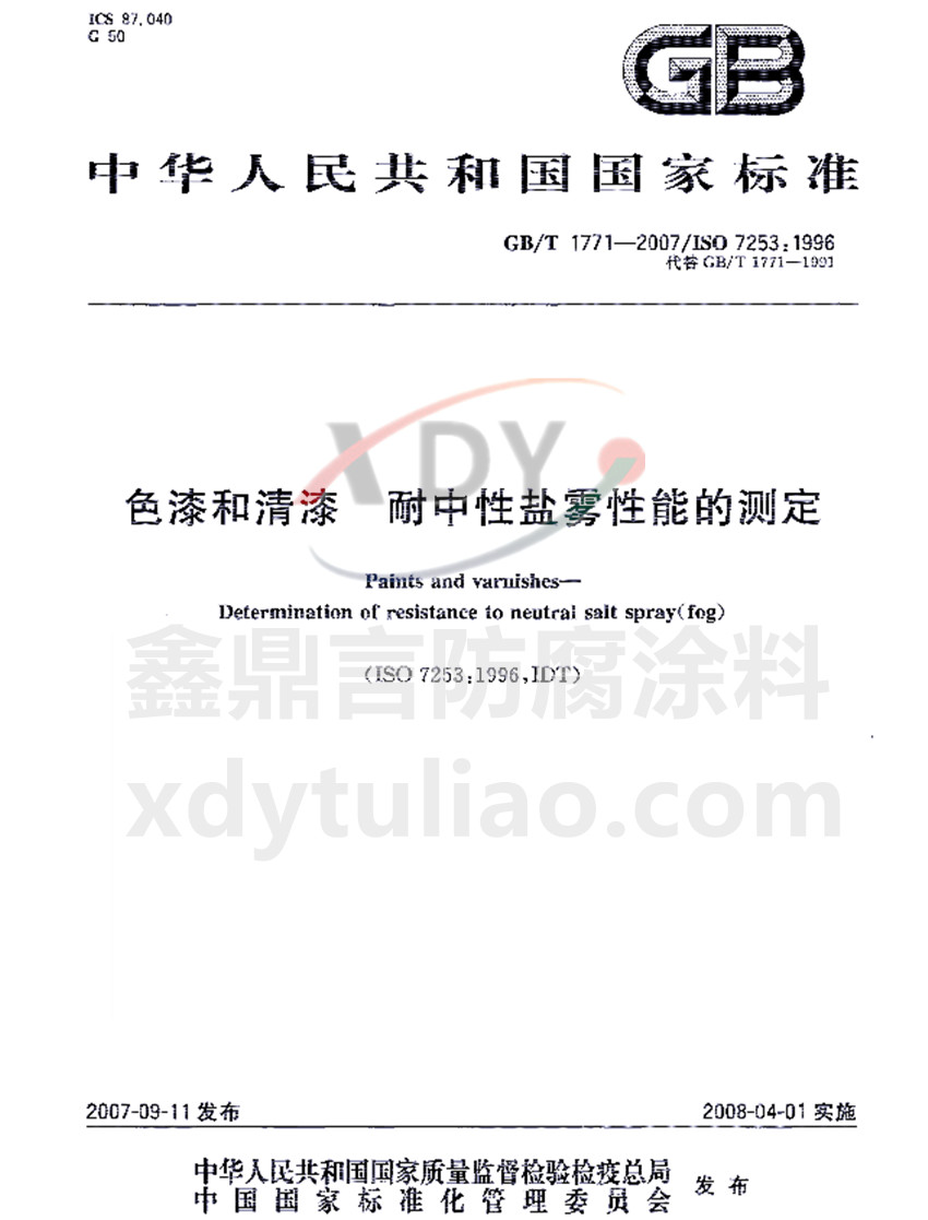 GB/T1771-2007色漆和清漆 耐中性鹽霧性能的測定標準是照搬GB/T1771-2007《色漆和清漆 耐中性鹽霧性能的測定​》紙質版內容。大家可以放心參考。 ICS 87.040 G50 GB 中華人民共和國國家標準 GB/T1771-2007/ISO 7253:1996代替GB/T1771-1991 色漆和清漆 耐中性鹽霧性能的測定Paints and var