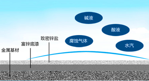 當涂膜上有部位損傷后,露出基體金屬,在較小面積內腐蝕電流能流向鋼鐵露出部分,則鋅的產物就沉積在此處形成一層保護膜,延緩腐蝕繼續(xù)發(fā)生。