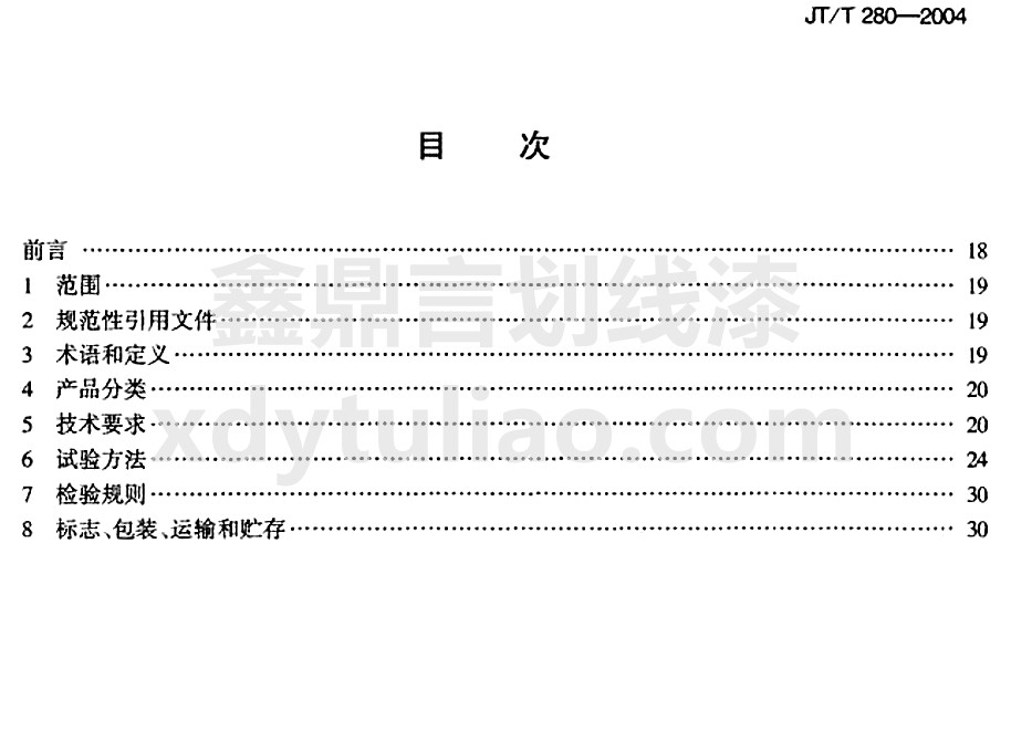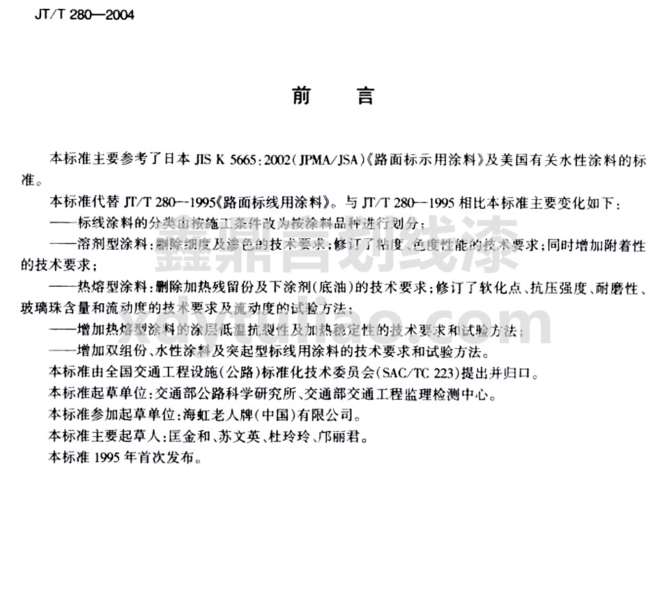 JT/T 280-2004路面標(biāo)線涂料標(biāo)準(zhǔn)是小編照搬JT/T 280-2004《路面標(biāo)線涂料》紙質(zhì)版內(nèi)容,大家可以放心參考。更多防腐涂料執(zhí)行國家和行業(yè)標(biāo)準(zhǔn)等防腐涂料相關(guān)信息可以參與網(wǎng)站:m.tzhdmjg.com