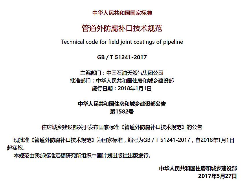 管道外防腐補(bǔ)口技術(shù)規(guī)范施工工藝標(biāo)準(zhǔn)GB/T 51241-2017